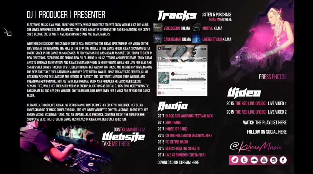 Are you trying to set yourself apart from other artists? Maybe you’re trying to find a creative way to get an event promoter or label owner to notice your brand. We create clickable electronic press-kits that are attractive and easy to navigate through via desktop or mobile device. With these attractive media press-kits you can showcase you talents and experience as an Artist, DJ or Producer. These kits are also perfect for press releases and interviews, giving the potential interviewer insight to your brand. Don’t forget sponsorship and labels that are on the look out for professional artists.